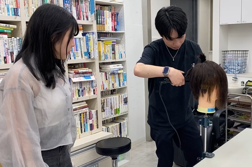 | ▲専門学生のサロン見学の際の一コマ。 先輩アシスタントが練習しているところを 見学しています。 |