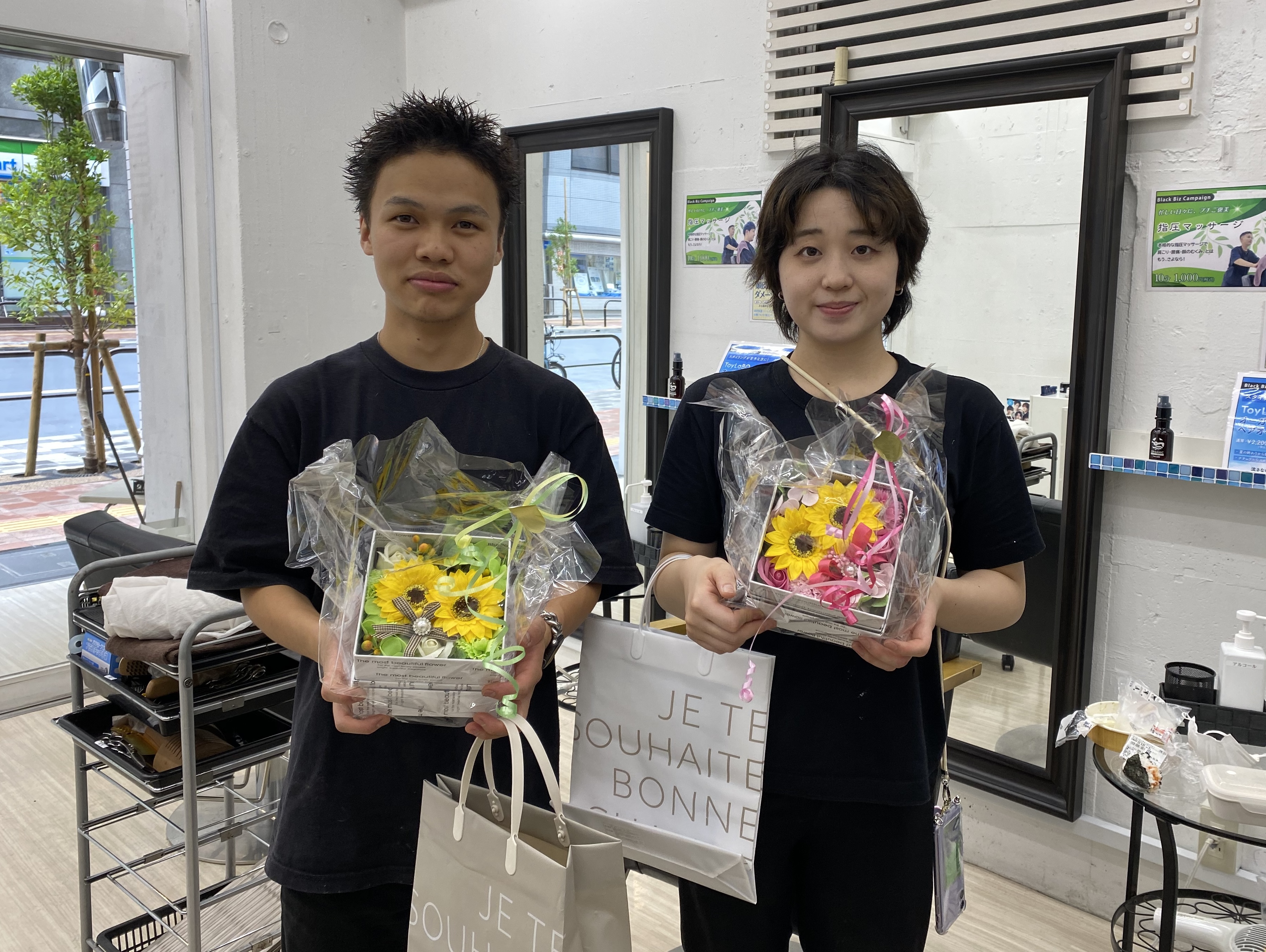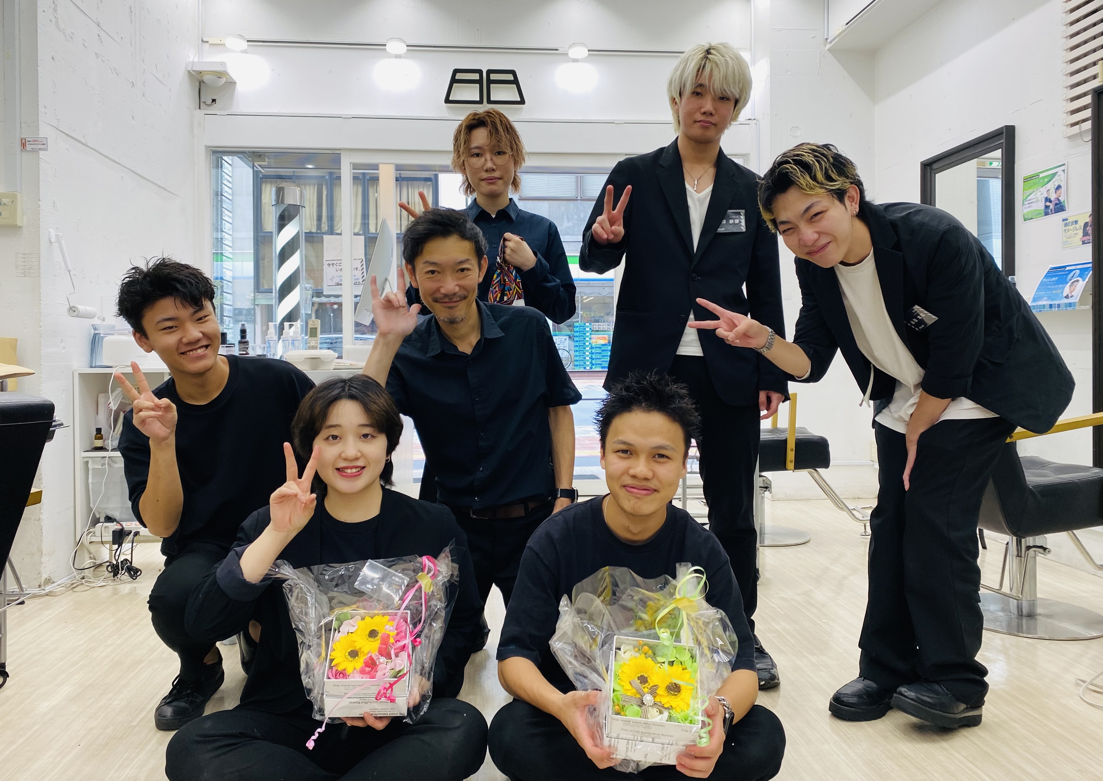 | ▲Black Bizの新卒第2期生が無事に美容学校を修了。先輩後輩たち皆でお祝いしました。 | ▲3年間、仕事と学校の両立を頑張ってくれました。大変なこともありましたが、同期の絆で乗り越えられたと思います。 |