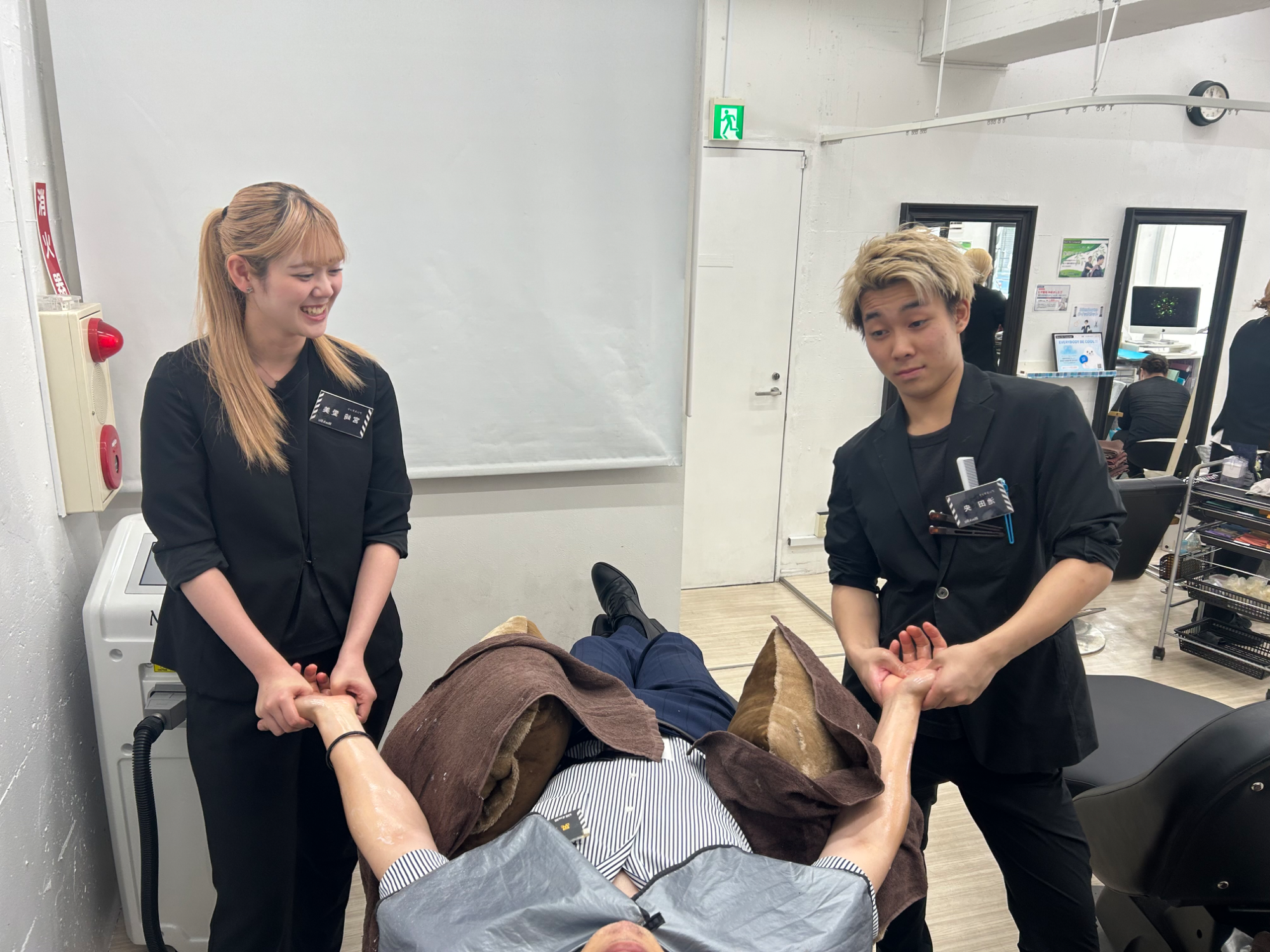 | ▲月に一度のアシスタント合同練習会!現在は秋葉原の店舗で集まり行っています。今年4月に入社したスタッフも色んなことを学んでいる途中です。先輩が実際に施術を受けながら指導しています。 | ▲スタッフの誕生日月にはみんなでお祝いのランチ会♪ 本人が食べたいものをリクエストします。いつも社長がご馳走してくださっています! |